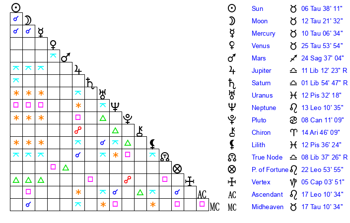 | Moon | 12 Taurus 28 | 6 Taurus 15 | 26 Aquarius 44 |