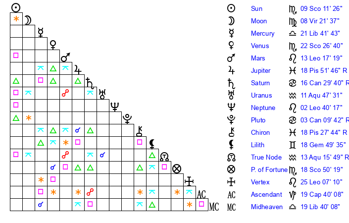 | Sun | 9 Scorpio 11 | 10 Scorpio 31 | 0 Pisces 44 |