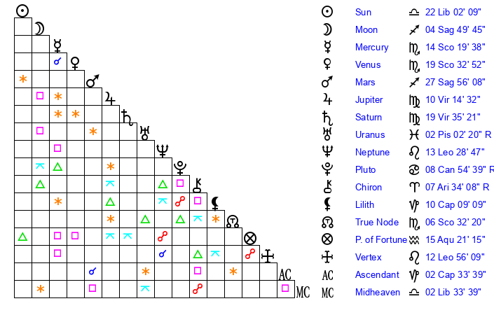 | Saturn | 20 Virgo 13 | 26 Pisces 36 | 25 Virgo 0 |