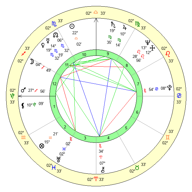 | Venus | 19 Scorpio 33 | 2 Libra 15 | 24 Pisces 34 |