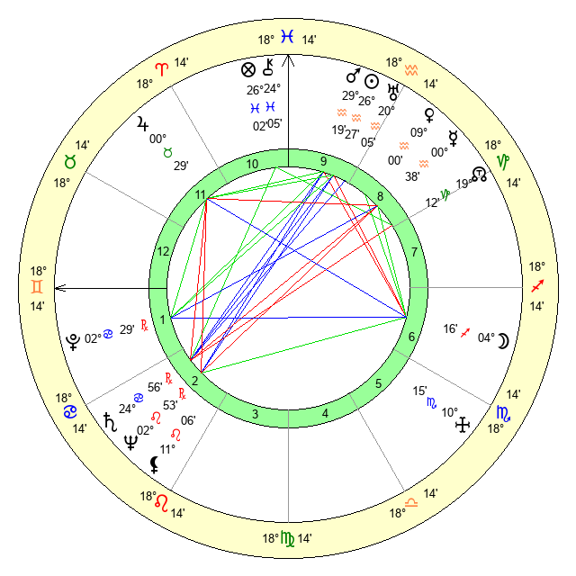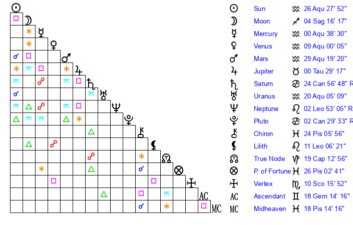 | Sun | 26 Aquarius 28 | 27 Aquarius 16 | 12 Gemini 30 |