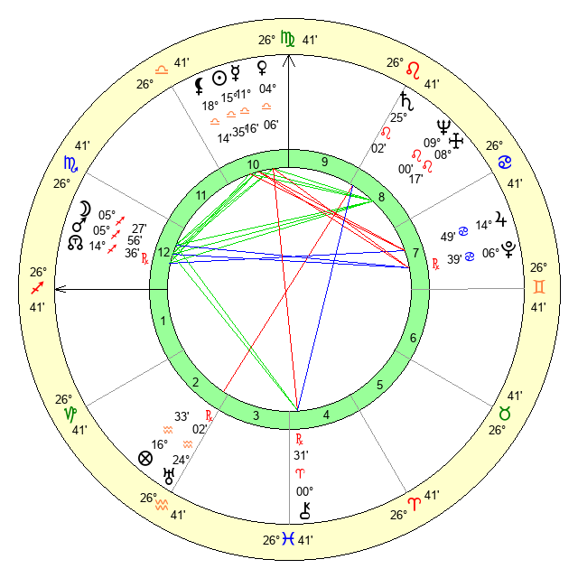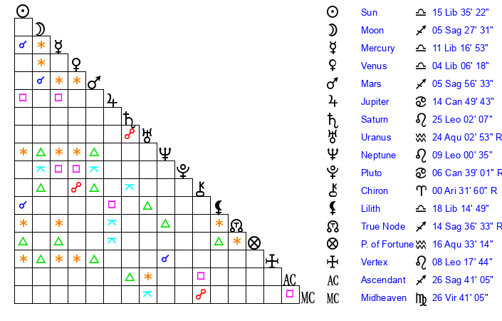 | Saturn | 25 Leo 42 | 27 Pisces 0 | 27 Leo 14 |
