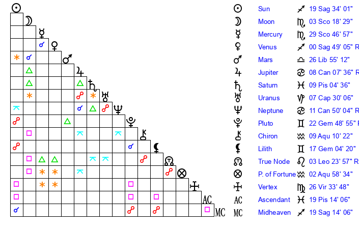 | Mercury | 29 Scorpio 47 | 7 Sagittarius 24 | 21 Pisces 46 |