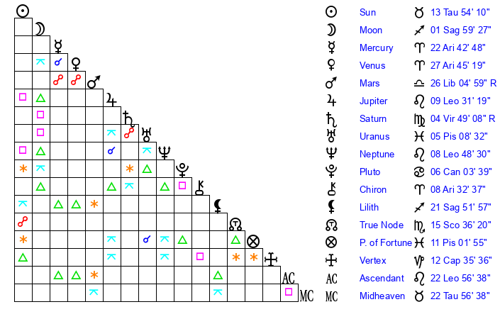 | Neptune | 8 Leo 48 | 1 Aries 12 | 11 Leo 46 |