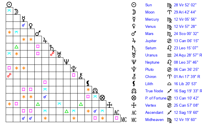 | Sun | 28 Virgo 51 | 29 Virgo 56 | 16 Capricorn 22 |