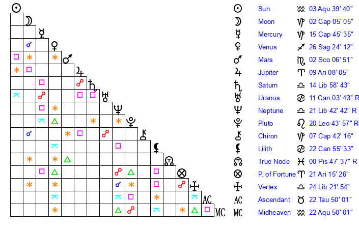 | Sun | 3 Aquarius 40 | 4 Aquarius 58 | 16 Aries 50 |