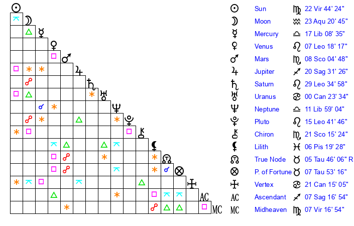 | Sun | 22 Virgo 45 | 23 Virgo 6 | 9 Sagittarius 26 |
