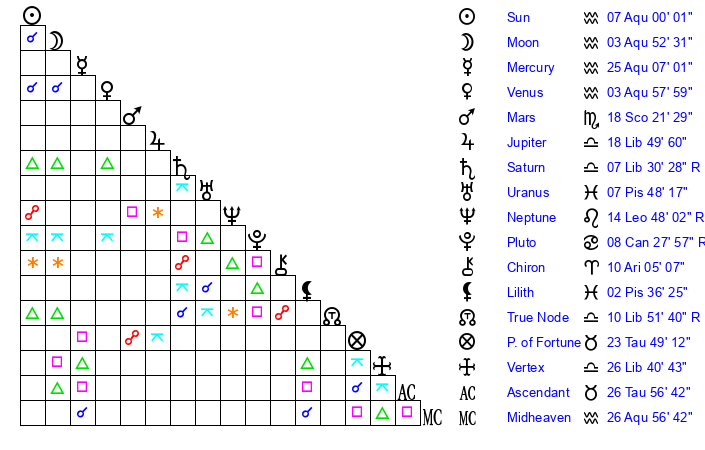 | Uranus | 7 Pisces 47 | 23 Taurus 17 | 12 Pisces 59 |