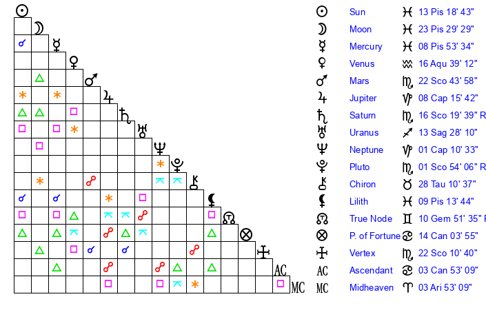 Sun | 13 Pisces 19 | 13 Pisces 22 | 23 Aries 57 |