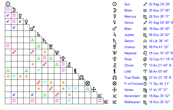 | Mars | 18 Aquarius 27 | 15 Sagittarius 23 | 3 Taurus 19 |