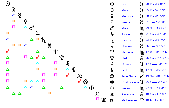 | Sun | 20 Pisces 42 | 21 Pisces 22 | 16 Gemini 30 |