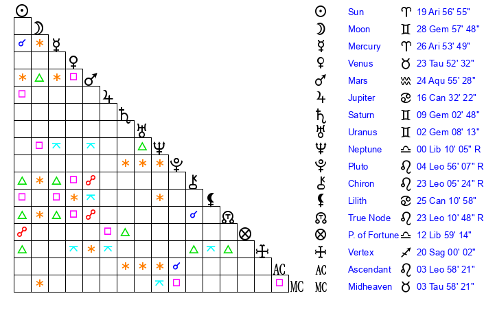 | Moon | 28 Gemini 59 | 25 Virgo 48 | 29 Gemini 46 |