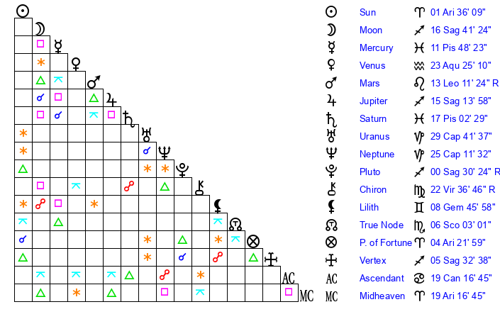Sun | 1 Aries 36 | 2 Aries 19 | 1 Taurus 7 |