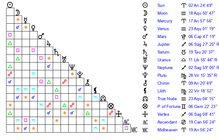 | Venus | 23 Aquarius 1 | 2 Aries 15 | 27 Aries 47 |