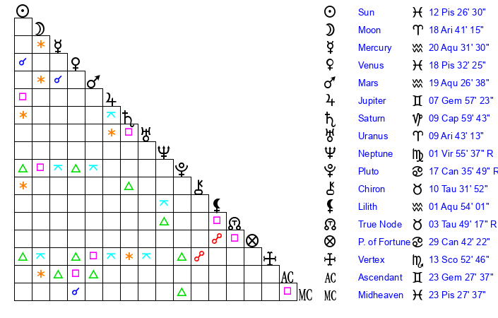 | Sun | 12 Pisces 27 | 13 Pisces 24 | 15 Gemini 17 |