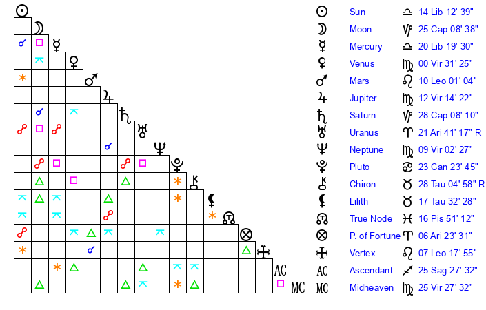 | Sun | 14 Libra 12 | 14 Libra 41 | 17 Capricorn 59 |