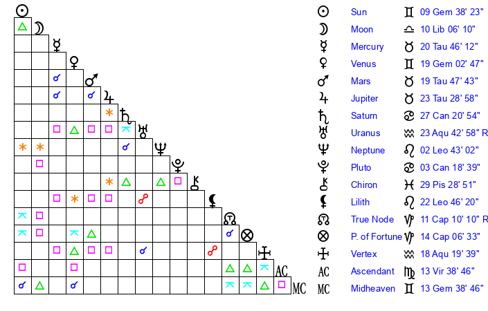 | Sun | 9 Gemini 38 | 10 Gemini 29 | 23 Virgo 14 |
