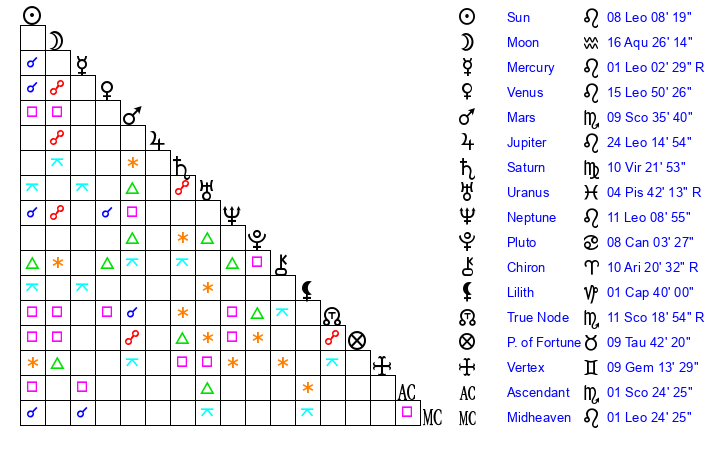 | Sun | 8 Leo 8 | 8 Leo 44 | 21 Scorpio 2 |