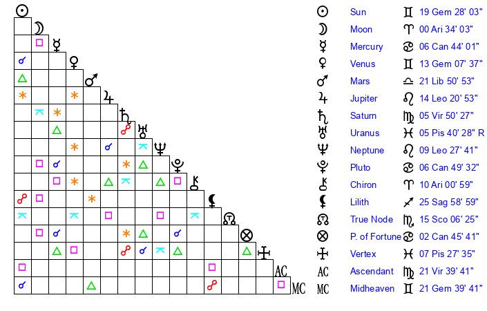 | Sun | 19 Gemini 28 | 20 Gemini 4 | 0 Libra 21 |