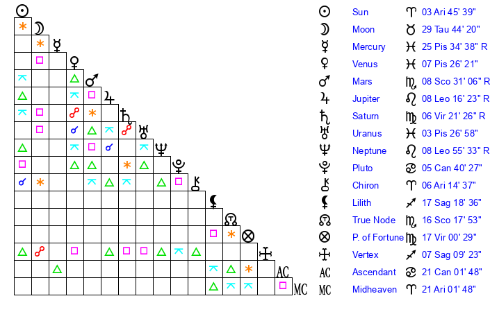 | Sun | 3 Aries 45 | 4 Aries 18 | 15 Cancer 13 |