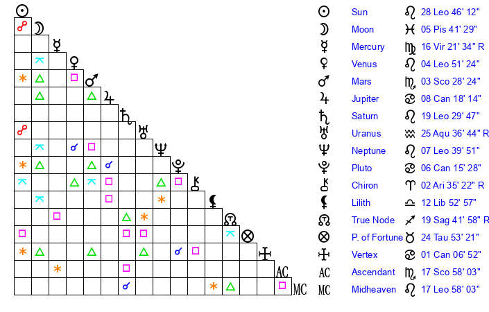 | Sun | 28 Leo 46 | 29 Leo 51 | 14 Sagittarius 47 |