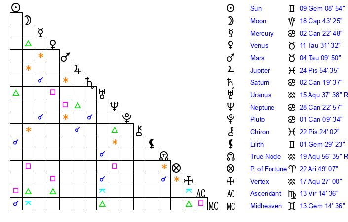 | Jupiter | 24 Pisces 39 | 27 Gemini 56 | 23 Pisces 0 |