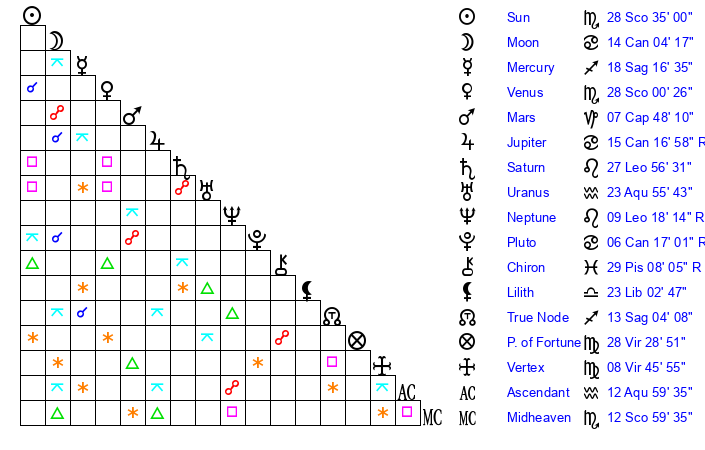 | Sun | 28 Scorpio 35 | 29 Scorpio 38 | 17 Pisces 5 |