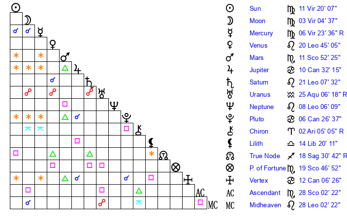 | Moon | 2 Virgo 59 | 3 Aquarius 31 | 5 Leo 21 |