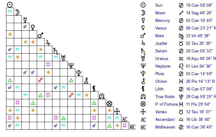 | Moon | 14 Sagittarius 48 | 12 Aquarius 59 | 12 Sagittarius 44 |