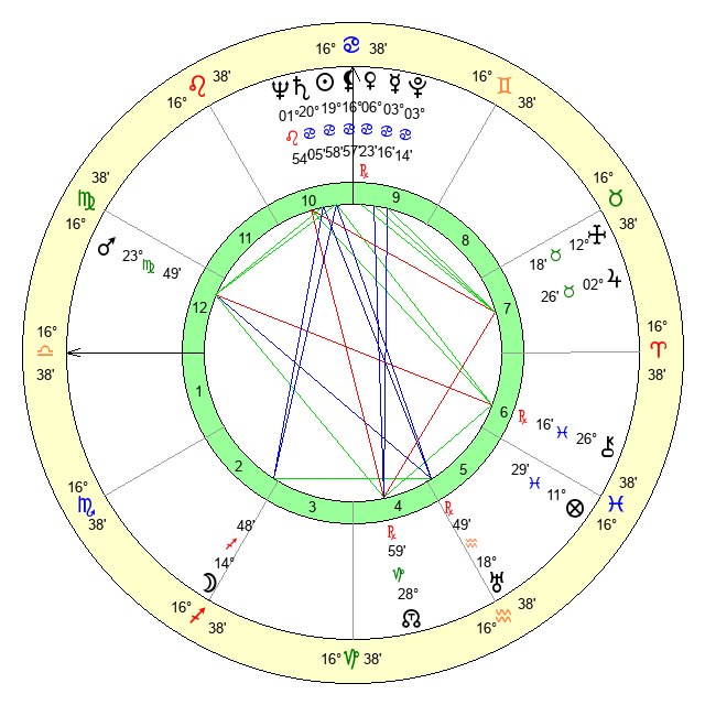 | Sun | 19 Cancer 58 | 20 Cancer 36 | 5 Scorpio 57 |