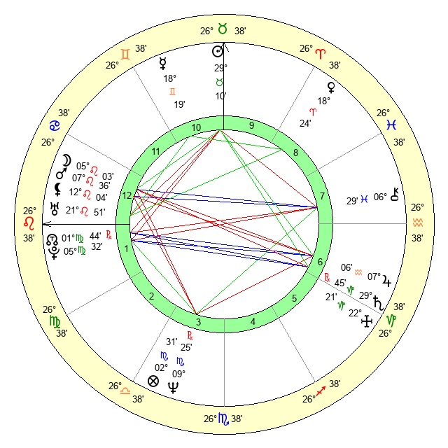 | Sun | 29 Taurus 11 | 29 Taurus 41 | 0 Leo 20 |