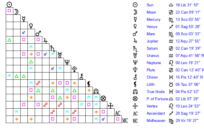 | Sun | 18 Libra 31 | 19 Libra 37 | 10 Aquarius 45 |
