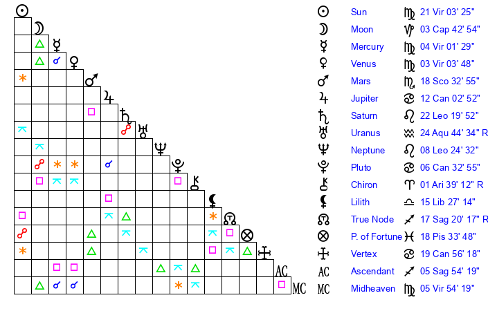 | Sun | 21 Virgo 3 | 22 Virgo 8 | 8 Capricorn 12 |