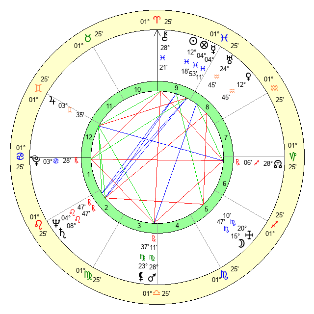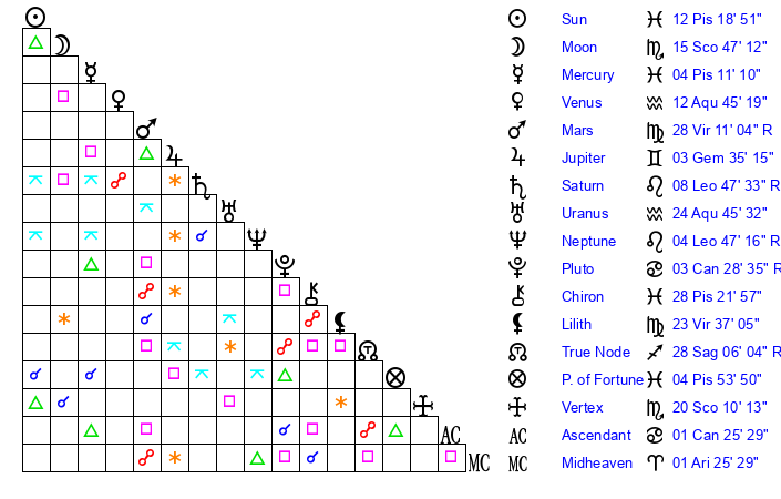 | Sun | 12 Pisces 19 | 13 Pisces 22 | 26 Gemini 37 |
