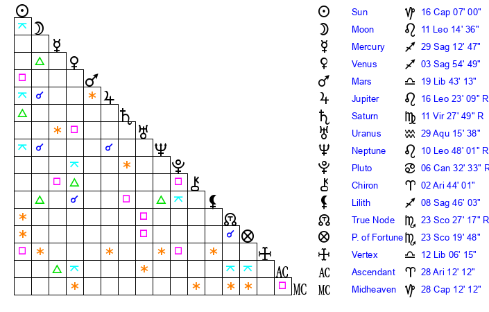 | Venus | 3 Sagittarius 55 | 17 Capricorn 39 | 13 Aries 2 |