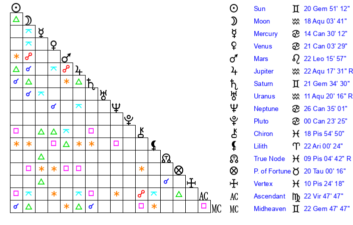 | Sun | 20 Gemini 51 | 21 Gemini 58 | 7 Libra 40 |