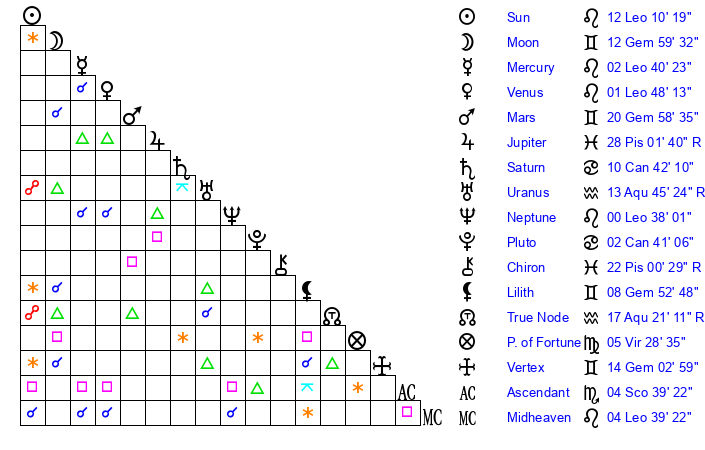 | Neptune | 0 Leo 39 | 1 Aries 54 | 2 Leo 35 |