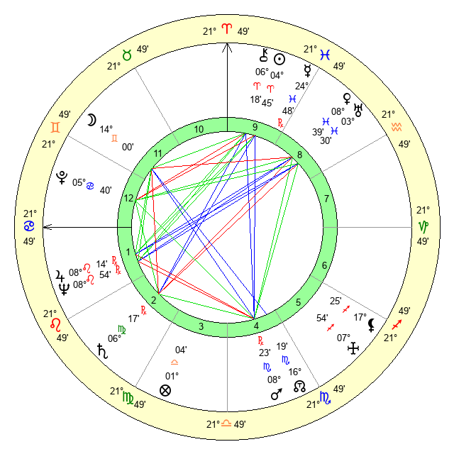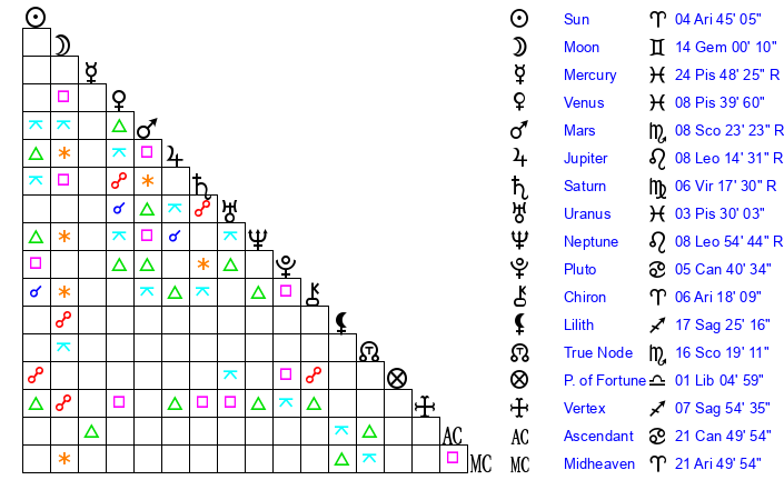 | Moon | 14 Gemini 3 | 14 Aquarius 24 | 9 Aries 51 |