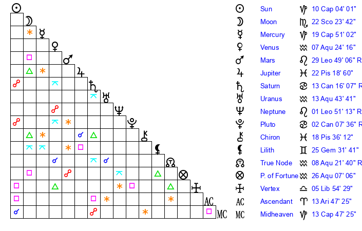 | Moon | 22 Scorpio 31 | 19 Gemini 1 | 5 Sagittarius 5 |