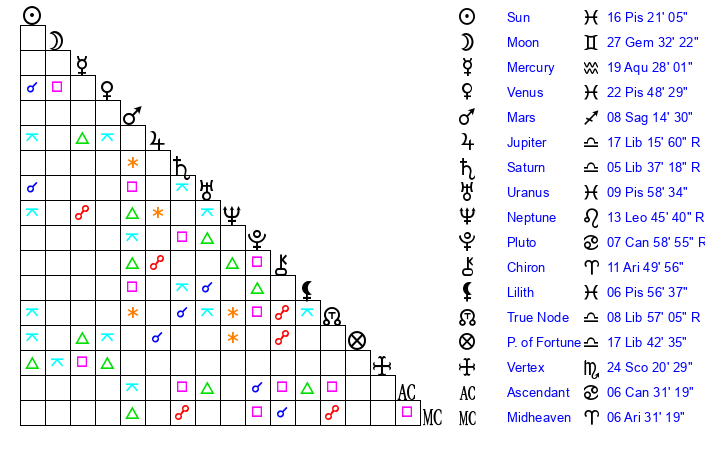 | Saturn | 6 Libra 21 | 21 Pisces 26 | 1 Libra 41 |