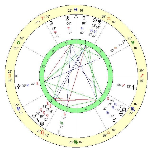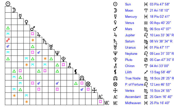 | Sun | 3 Pisces 47 | 5 Pisces 20 | 16 Gemini 36 |