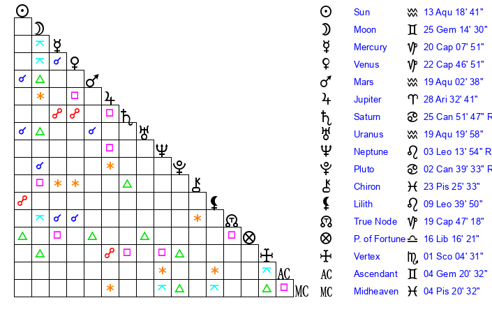 | Sun | 13 Aquarius 18 | 14 Aquarius 6 | 0 Gemini 2 |