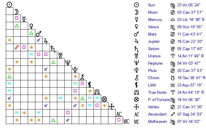 | Sun | 23 Virgo 5 | 24 Virgo 5 | 28 Sagittarius 6 |
