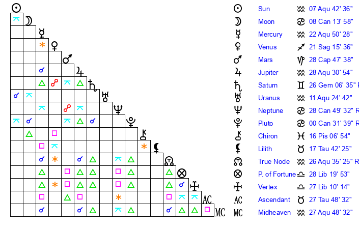 | Sun | 7 Aquarius 42 | 9 Aquarius 2 | 26 Taurus 39 |