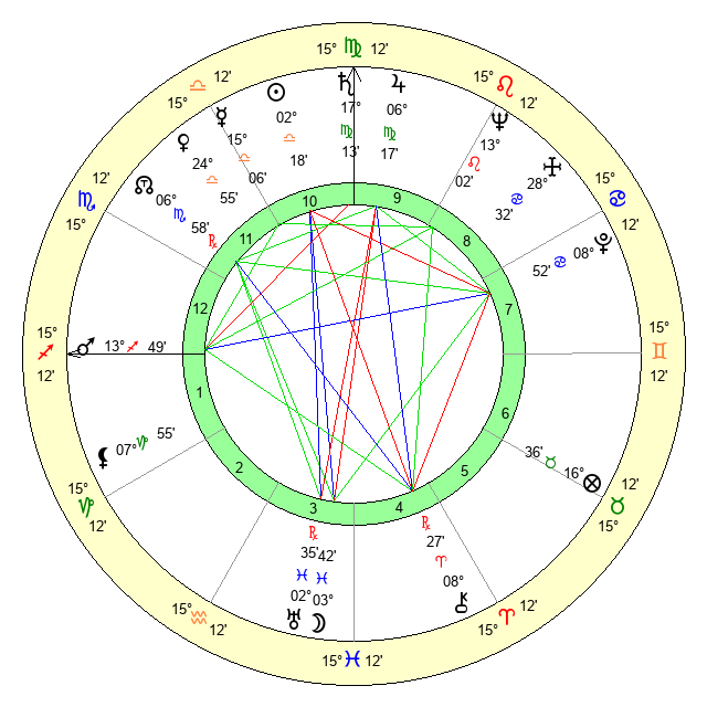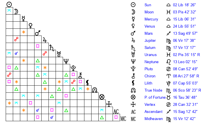 | Saturn | 17 Virgo 51 | 28 Pisces 3 | 25 Virgo 29 |