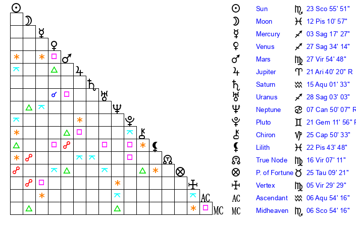 | Sun | 23 Scorpio 56 | 24 Scorpio 35 | 26 Pisces 27 |