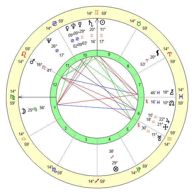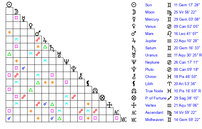 | Sun | 11 Gemini 17 | 12 Gemini 24 | 27 Virgo 51 |