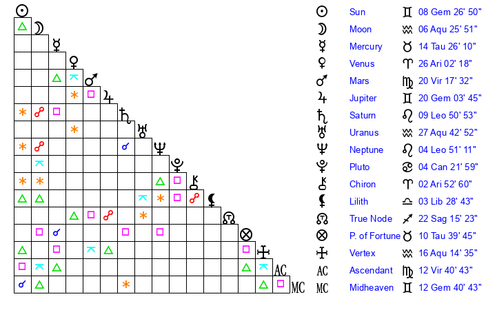 | Moon | 6 Aquarius 26 | 28 Cancer 11 | 3 Capricorn 40 |