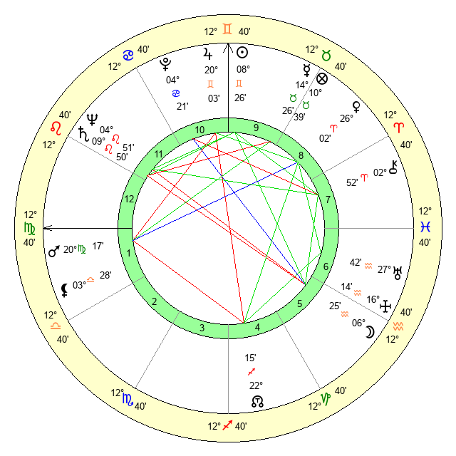 | Sun | 8 Gemini 27 | 9 Gemini 32 | 21 Virgo 3 |