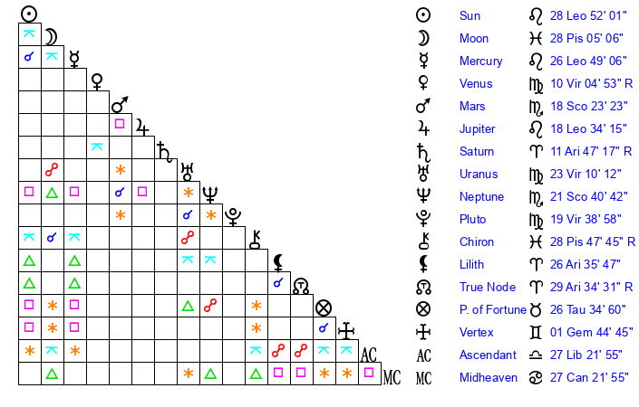 Mercury | 26 Leo 50 | 11 Leo 46 | 17 Scorpio 11 |